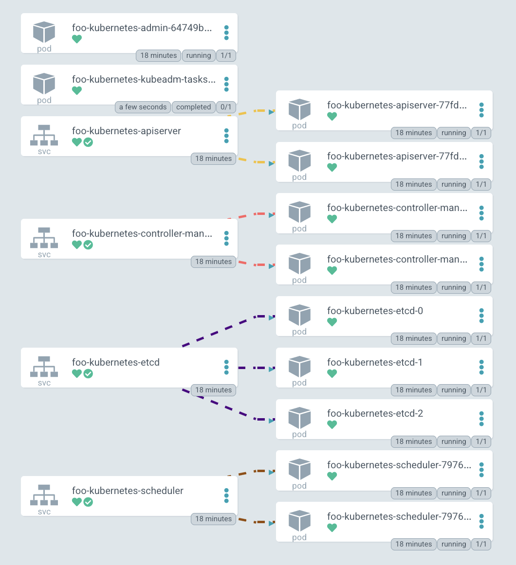 - Single binary, puts lots of pods on each node, and queries each pod to make sure that it is running.